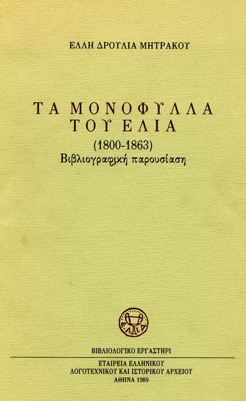 - Έλλη Δρούλια Μητράκου, Τα μονόφυλλα του ΕΛΙΑ (1800-1863). Βιβλιογραφική παρουσίαση, Αθήνα, Βιβλιολογικό Εργαστήρι – Εταιρεία Ελληνικού Λογοτεχνικού και Ιστορικού Αρχείου [Βιβλιολογικό Εργαστήρι 4], 1989 (8ο, 249 σ.)