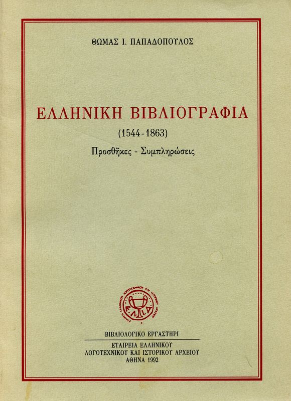 5. Φίλιππος Ηλιού, Ελληνική Βιβλιογραφία του 19ου αιώνα. Βιβλία – Φυλλάδια, τ. Α’, 1801-1818, Βιβλιολογικό Εργαστήρι – Ελληνικό Λογοτεχνικό και Ιστορικό Αρχείο [Βιβλιολογικό Εργαστήρι 1], 1997 [=1998] (4ο, πζ’+733 σ.)