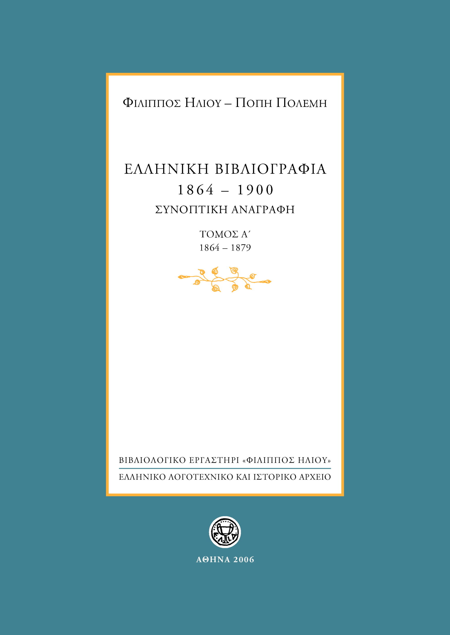 7. Φίλιππος Ηλιού – Πόπη Πολέμη, Ελληνική Βιβλιογραφία 1864-1900. Συνοπτική αναγραφή, τ. Α’-Γ’, Αθήνα, Βιβλιολογικό Εργαστήρι «Φίλιππος Ηλιού» – Ελληνικό Λογοτεχνικό και Ιστορικό Αρχείο, 2006 (8ο, 3.702 σ.)